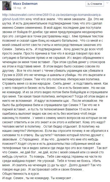 Еще один боец с псевдонимом Доберман (известный по видео о чеченцах: «Будем брить») заявил, что после конфликта с Семеном Семенченко его «заказали». «Я ушёл из батальона потому, что мою семью и меня слили, за моей семьей идет охота, и, как выяснилось, слил меня Сема. Считаю, он не имеет право на смерти парней идти в политику. Плевать на деньги. Просто нас всех кинули очень жестко», — сказал Доберман.